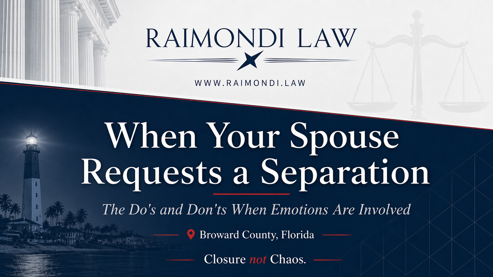 If your spouse asks for a separation in Broward County, Florida, the smartest reaction is usually a calm one: listen carefully, avoid emotional mistakes, secure information, prioritize the children, and get legal guidance before making major moves. Florida’s family-law system is designed to address dissolution, support, parenting, and protection issues, but the path you choose early can shape everything that follows. When emotions are high, discipline matters. The right response today can make tomorrow far less chaotic. (Online Sunshine)